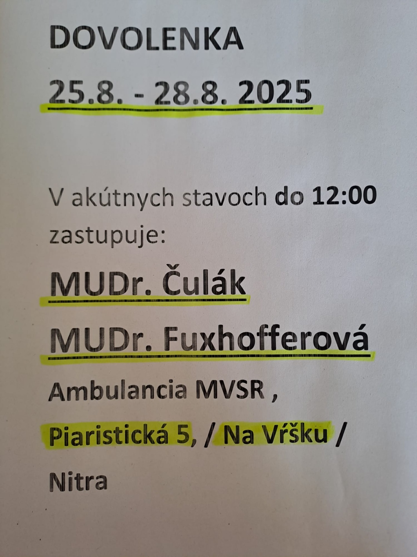 Upozorňujeme Vás drahí pacienti, že naša ambulancia bude čerpať dovolenku nasledovne: