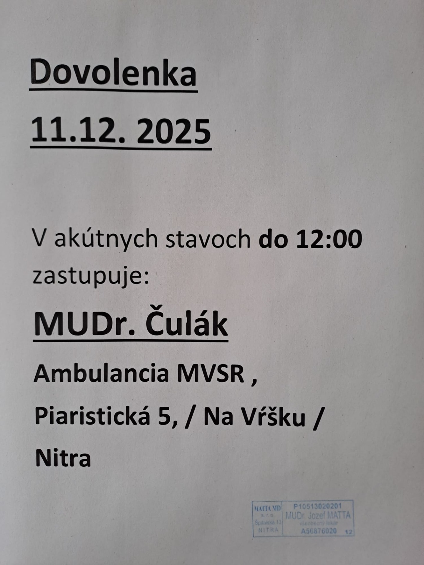 Upozorňujeme Vás drahí pacienti, že naša ambulancia bude dňa 11.12.2025 zatvorená (čerpanie dovolenky).